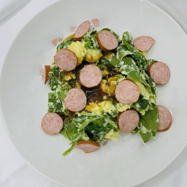 Boerenkool met rookworst, appelcompote en jus.